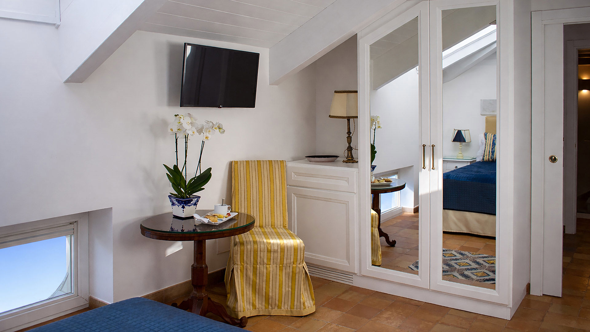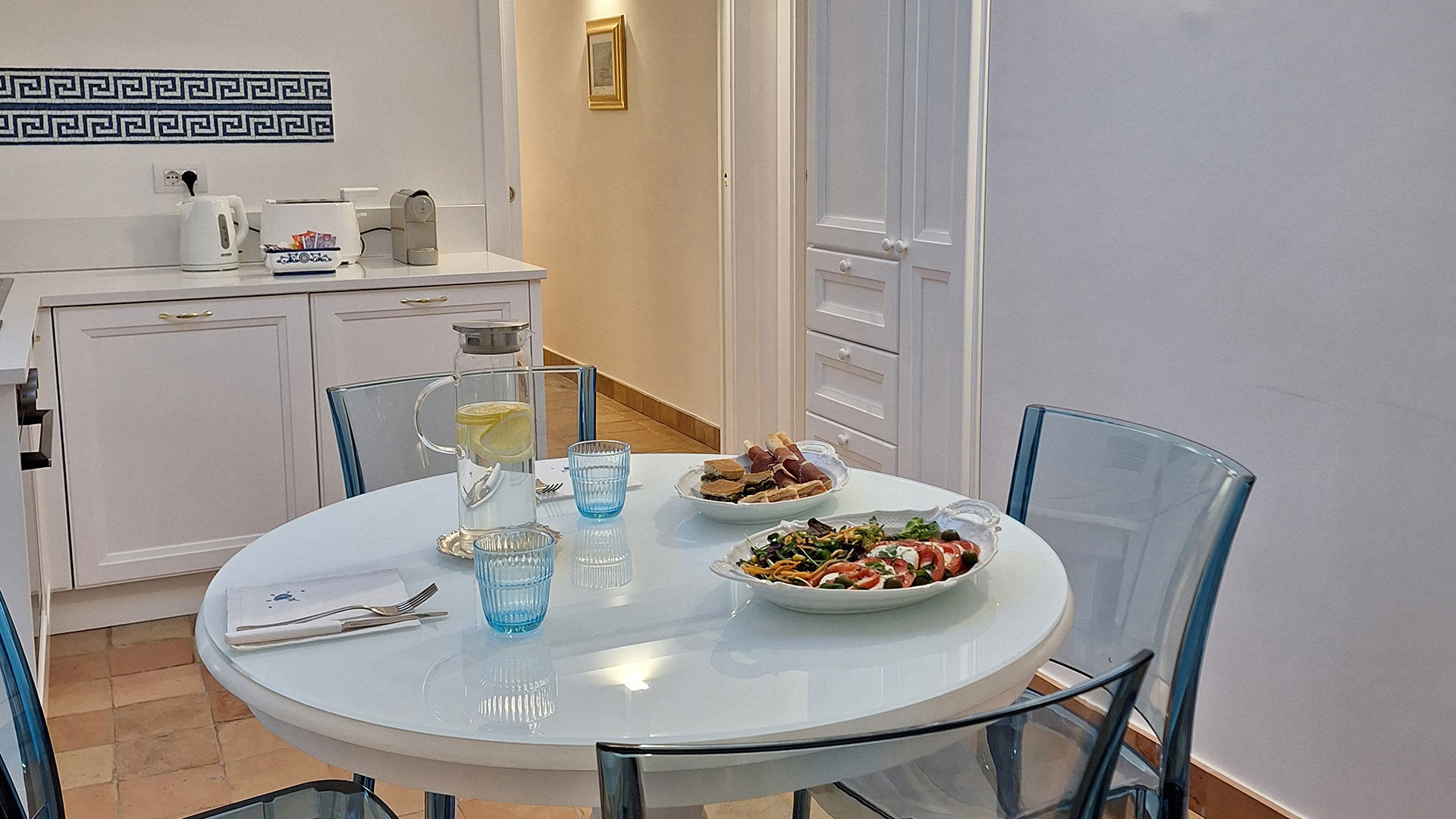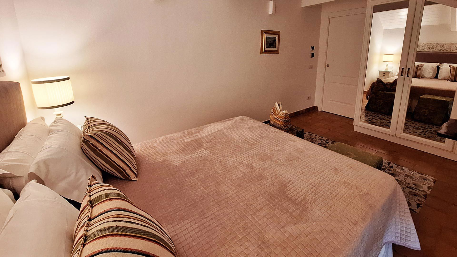 The interiors feature antique Neapolitan terracotta floors and traditional majolica tiles, reflecting the craftsmanship and cultural heritage of the Amalfi Coast.