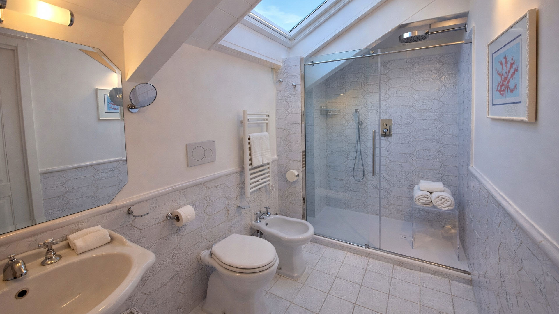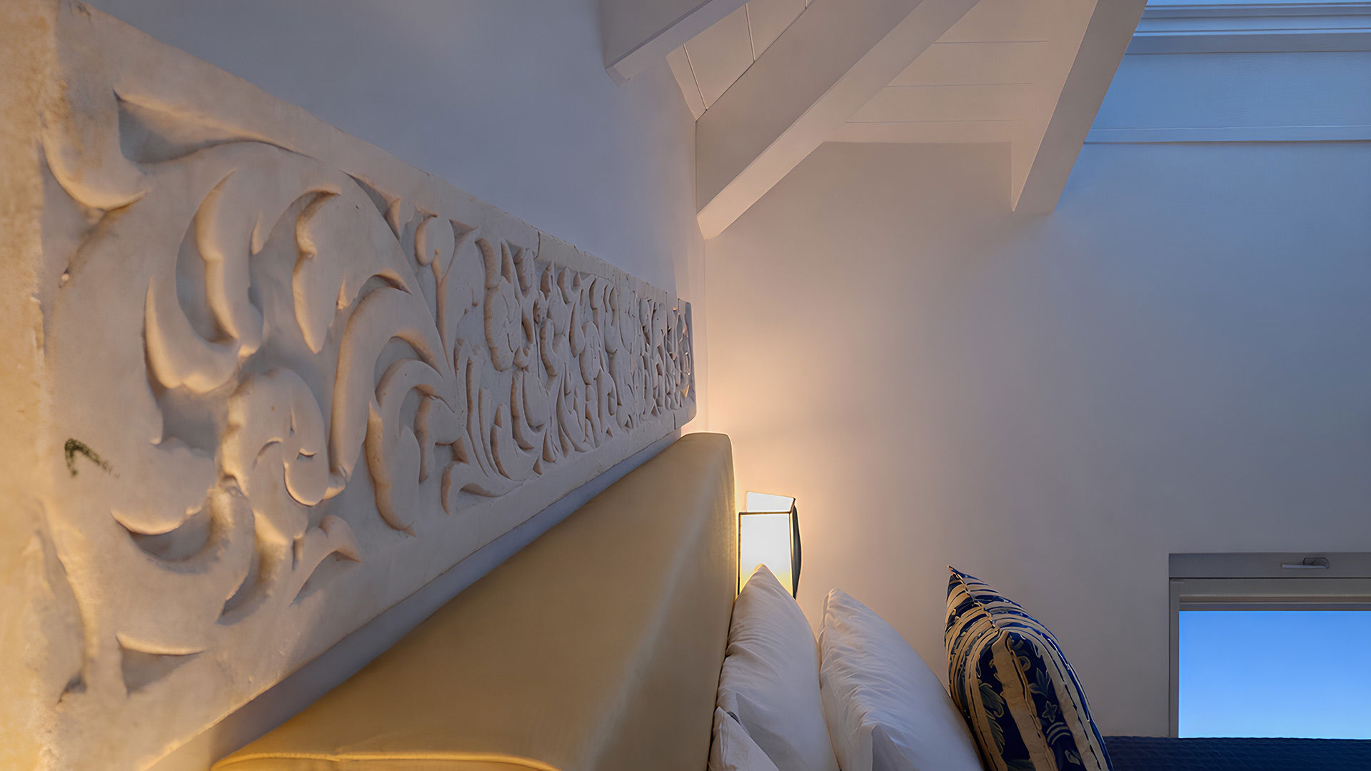 Located on the top floor of the building, the apartment enjoys pleasant views over Minori’s main square through large skylights, overlooking the historic Fontana dei Leoni, dating back to the early 19th century.